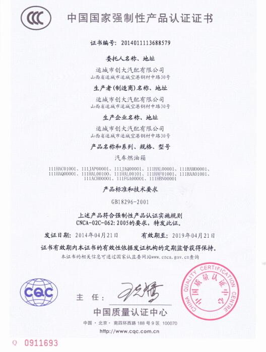 鋁合燃油箱3C證書